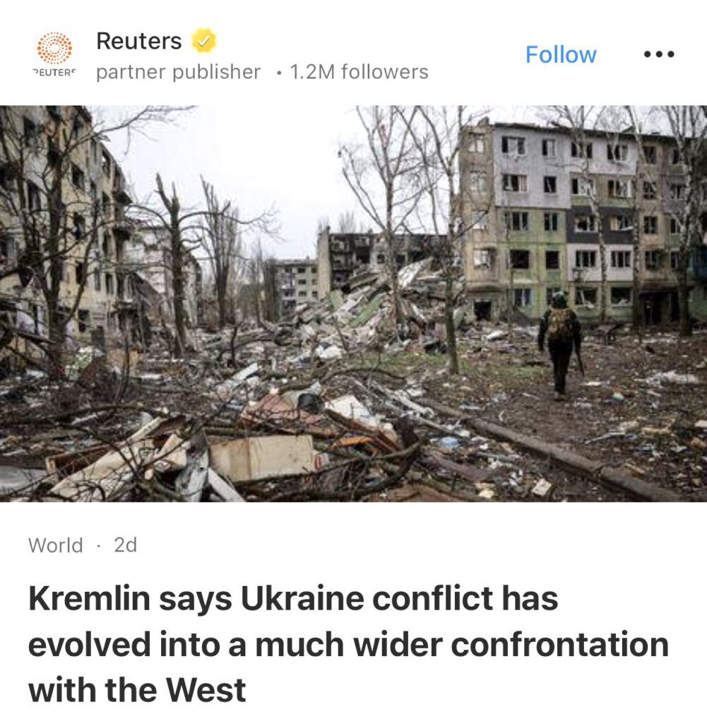 8。据Reuters报道,克里姆林宫表示,乌克兰冲突已经演变成与西方更广泛的对抗。