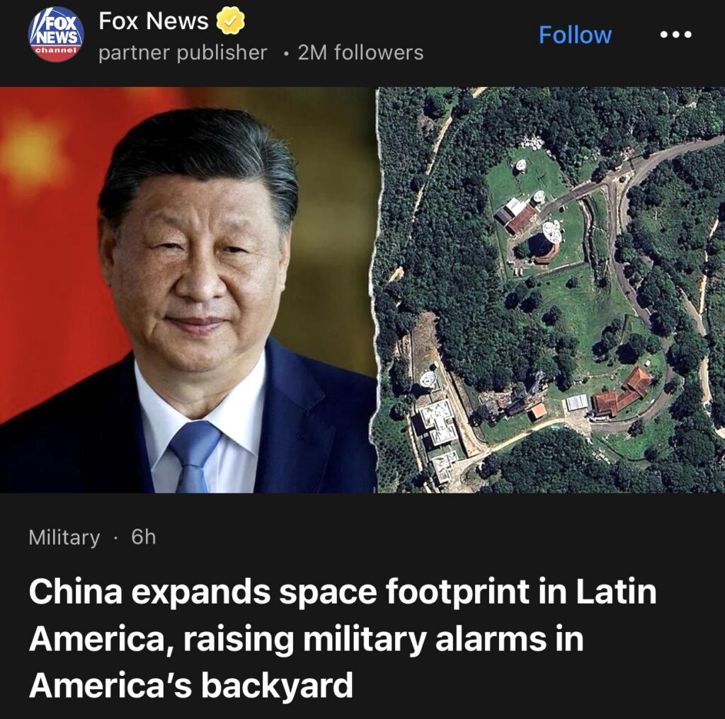11。据Fox News报道,中国扩大在拉丁美洲的太空足迹,引发美国后院的军事警觉。一份新报告称,中国正在拉丁美洲扩大太空设施网络,这可能会加强北京在西半球的军事监视和作战能力。
