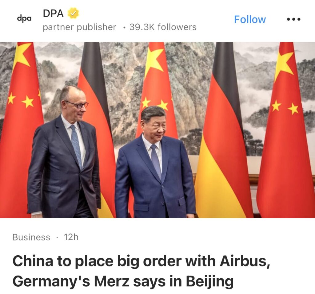 7。据DPA报道,德国梅尔茨在北京表示,中国将向空客下大订单。