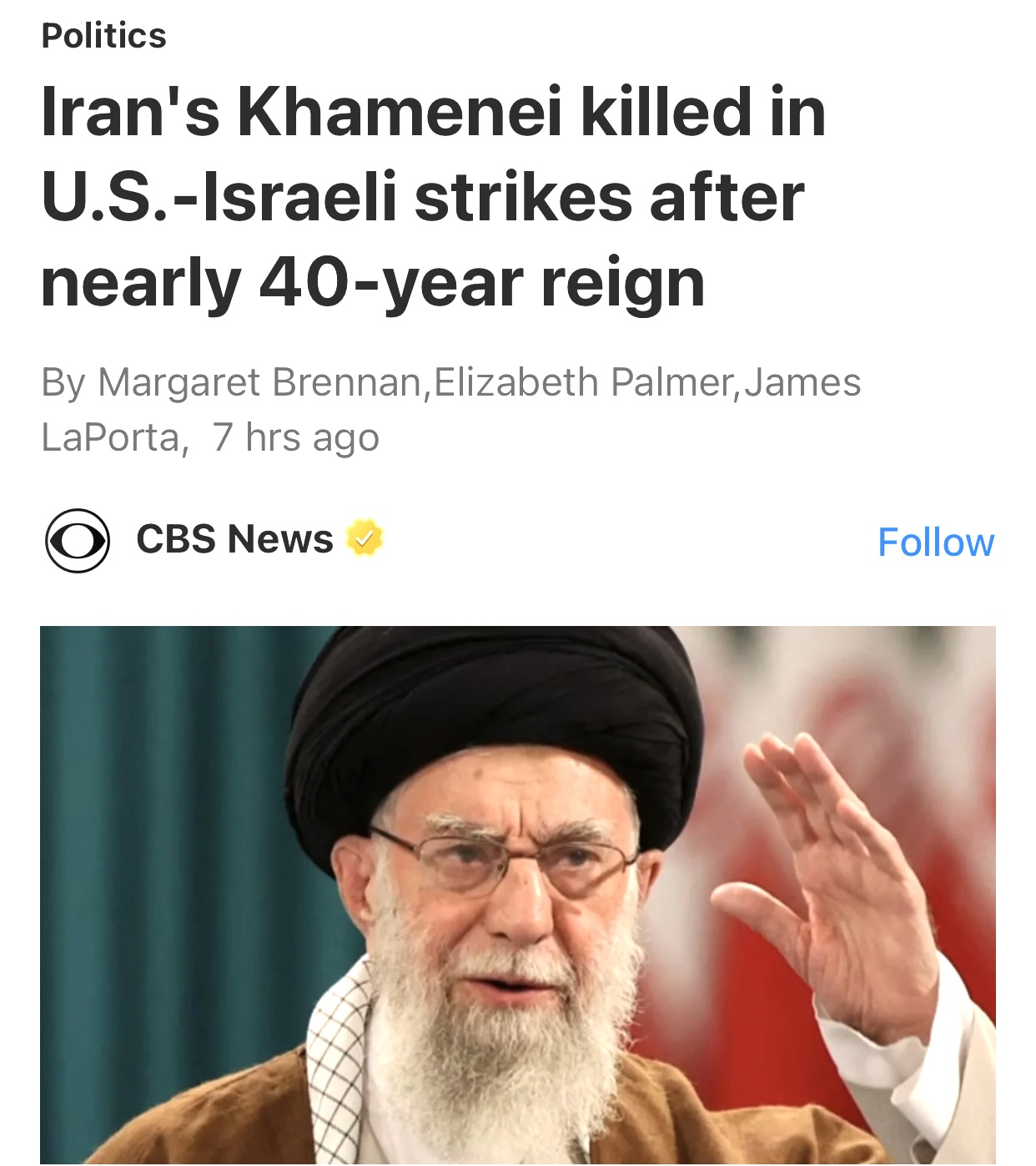 据CBS News报道,特朗普总统表示,伊朗最高领袖阿亚图拉·阿里·哈梅内伊在周六美国和以色列的大规模军事行动中丧生。
