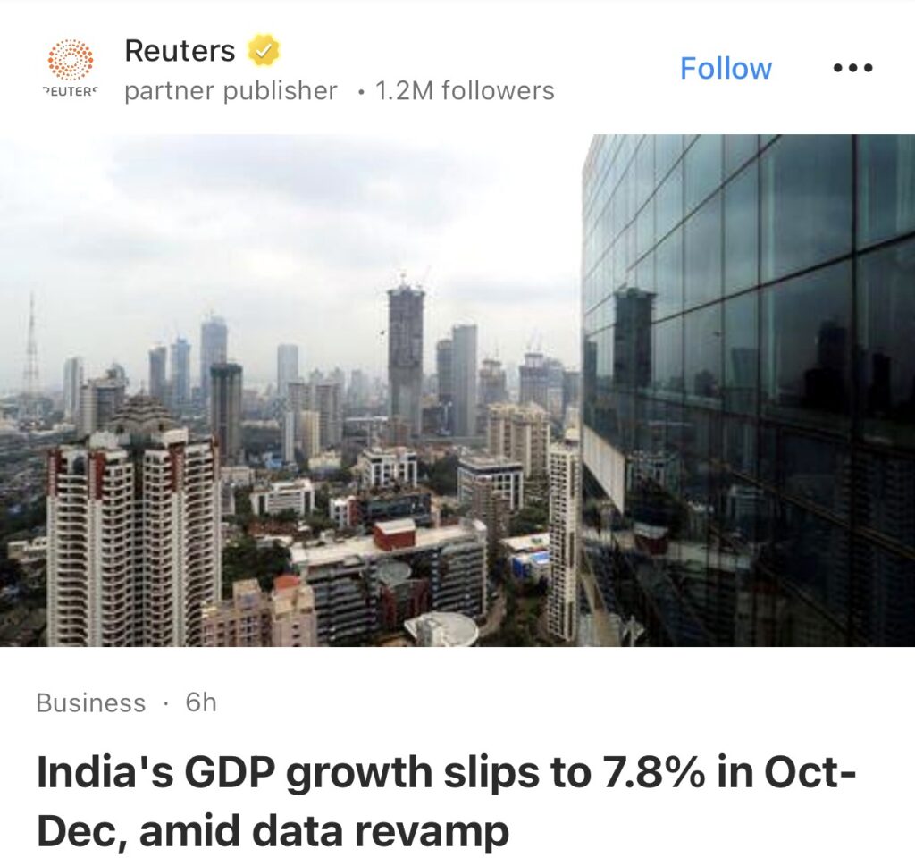 7。新德里,2月27日(路透社)——印度政府周五公布了一系列修订后的国民产出数据,称印度经济在10月至12月期间同比增长7.8%,此前一个季度增长了8.4%。
