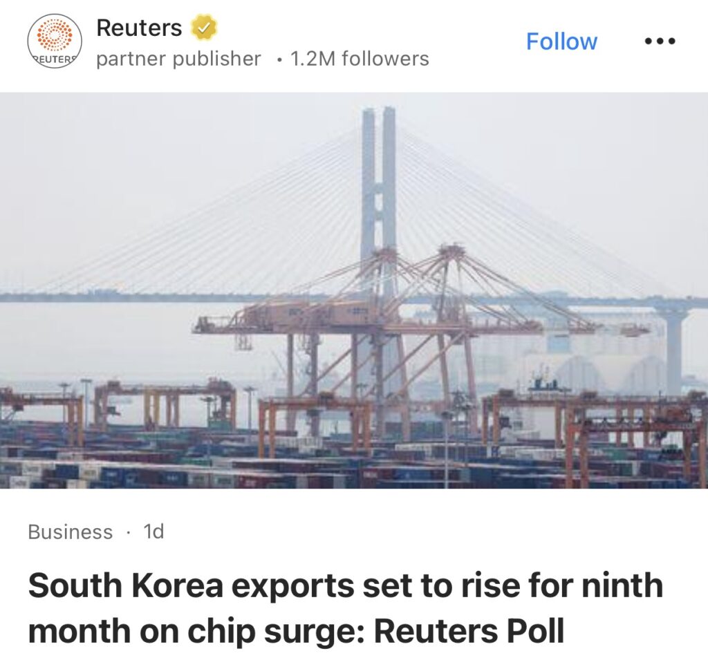 12。首尔,2月27日(路透社)——路透社周五公布的一项调查显示,由于全球人工智能投资热潮推动芯片销售激增,韩国2月份出口可能连续第九个月增长。