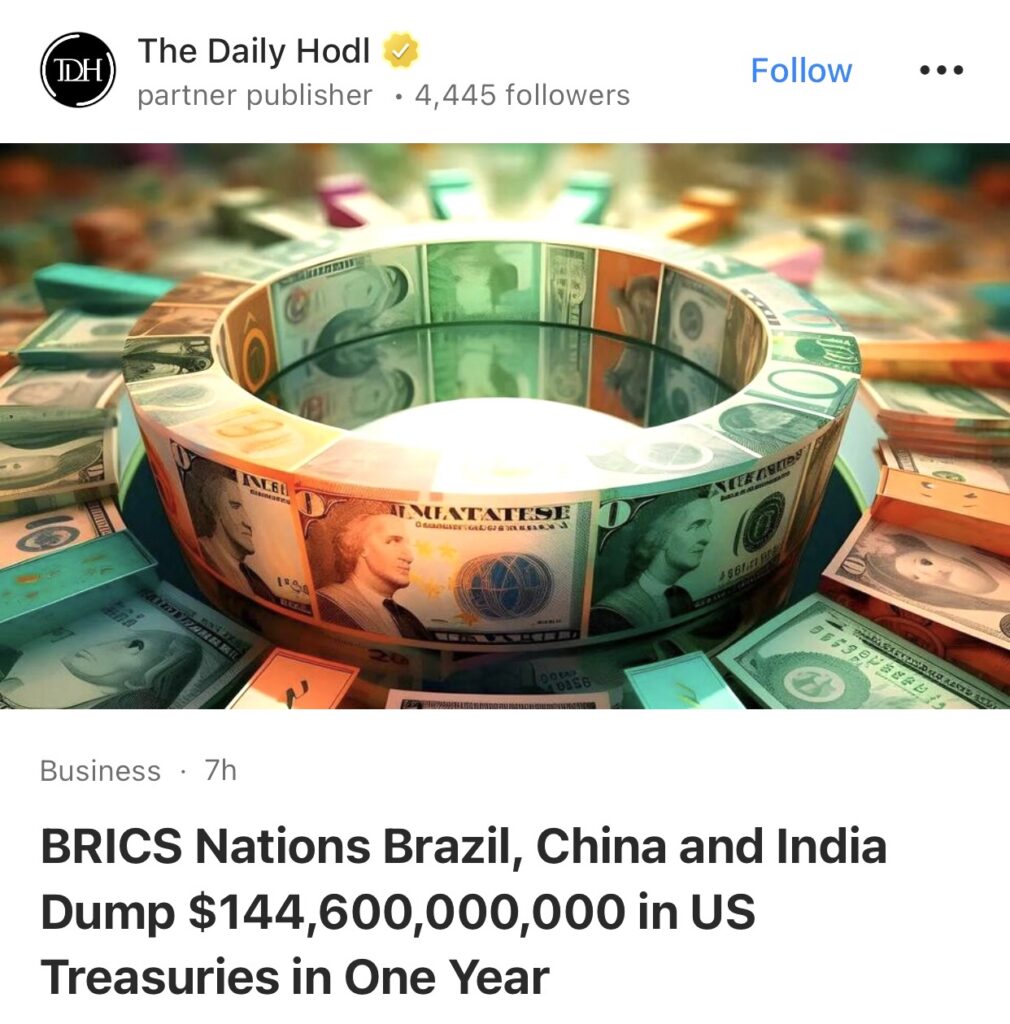 8。据The Daily Hodl报道,金砖国家巴西、中国和印度一年内抛售价值1446亿美元的美国国债。