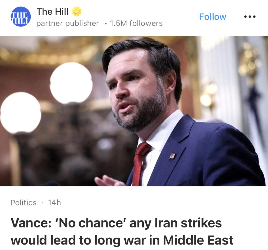 11。据The Hill报道,万斯称,伊朗的任何袭击都不可能”导致中东爆发长期战争。
