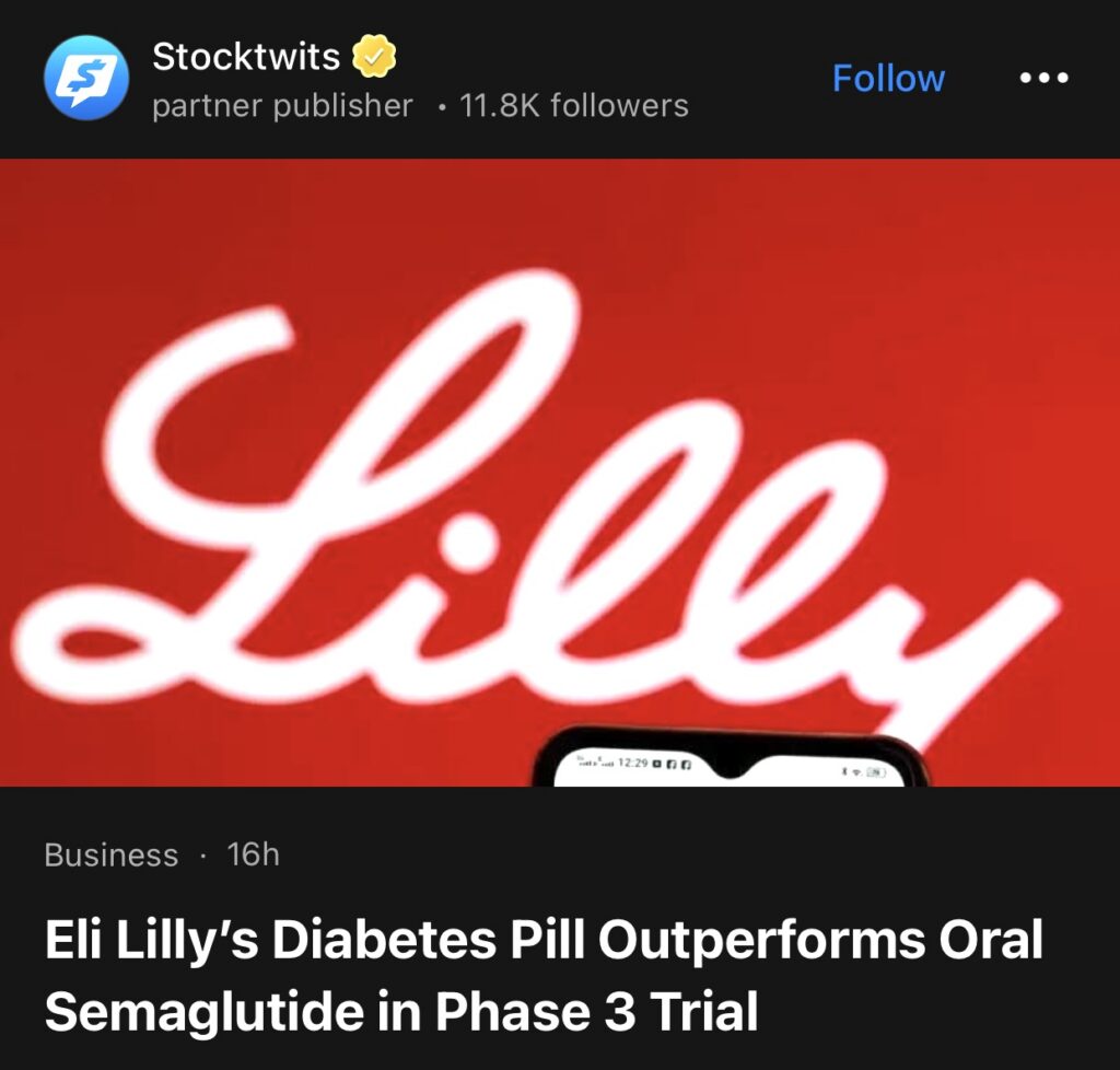 3。据Stocktwits报道,礼来公司(LLY)周四宣布,其试验性糖尿病药物Orforglipron在一项大型3期研究中表现优于口服索马鲁肽。在52周内降低血糖更强及减轻体重更大。