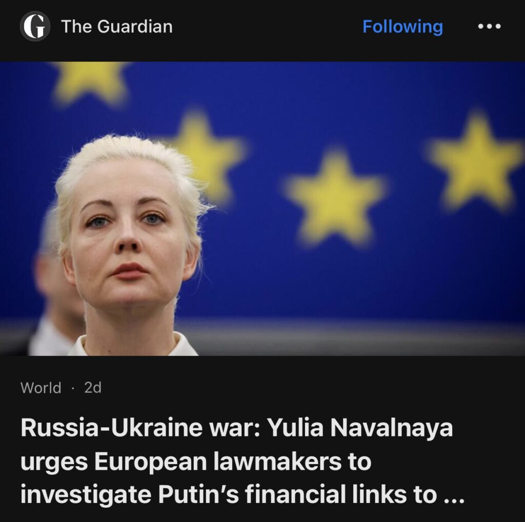 2。据The Guardian报道,已故俄罗斯反对派领导人阿列克谢·纳瓦尔尼的妻子尤利娅·纳瓦尔纳亚周三敦促欧洲政界人士和官员调查与俄罗斯总统普京及其盟友有关的西方资金流动。 “普京是一个有组织的犯罪团伙的头目。这包括投毒者和刺客,但他们只是傀儡。最重要的是与普京关系密切的人,他的朋友、同事和黑手党资金的持有者”。