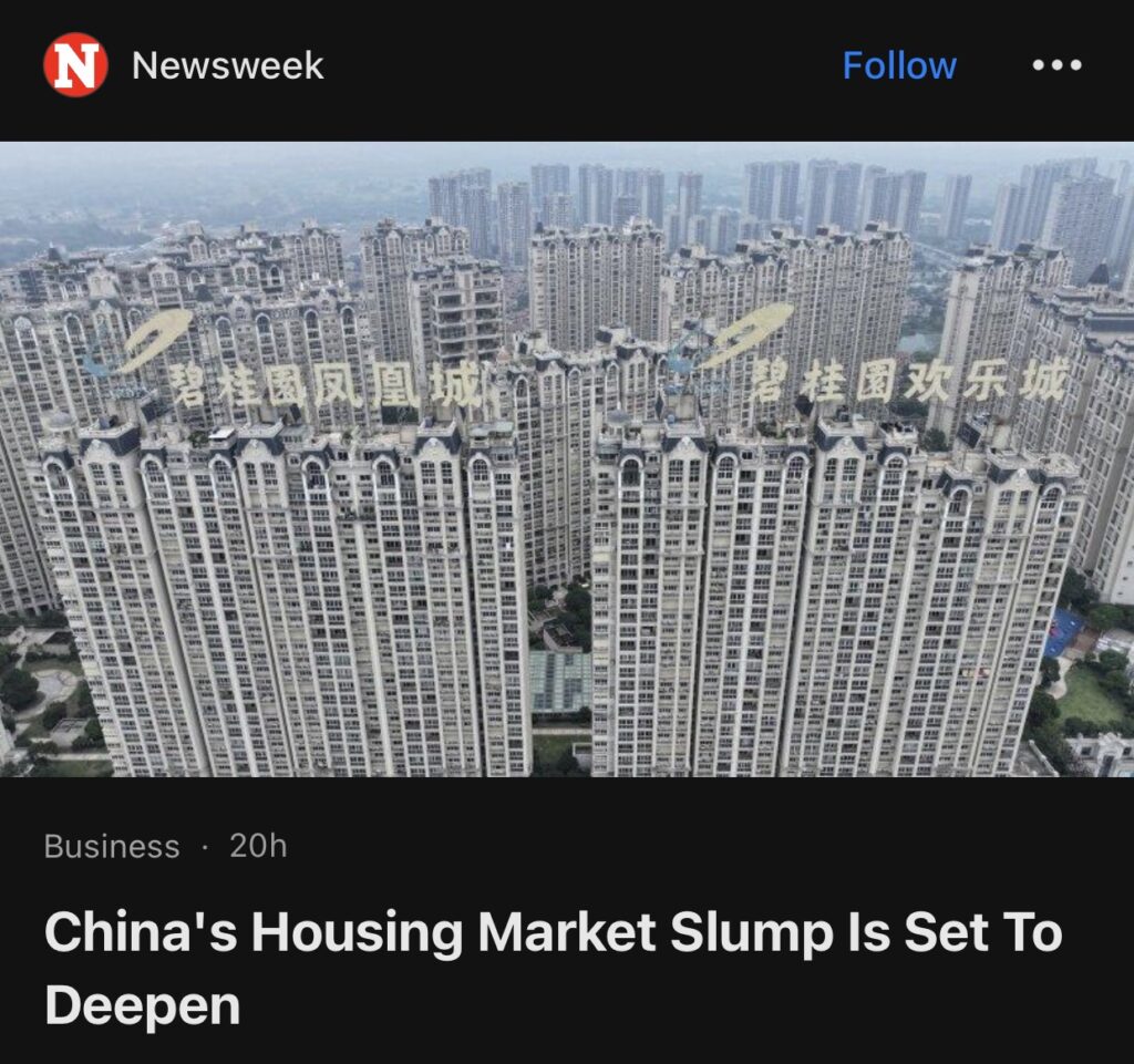 4。据Newsweek报道,中国房地产市场低迷将进一步加剧。中国房地产巨头碧桂园因未偿还债务而向债权人提出清算申请,该公司陷入困境。据周三报道,碧桂园控股公司因未偿债务而面临清算威胁。