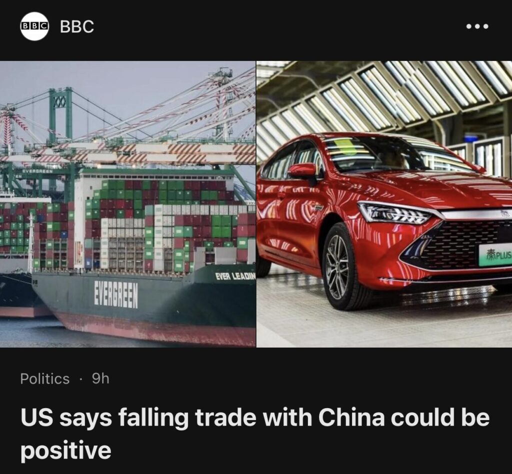 7。据BBC 报道,美国最高贸易官员告诉英国广播公司,与中国的贸易急剧下降可能是一个积极的进展。