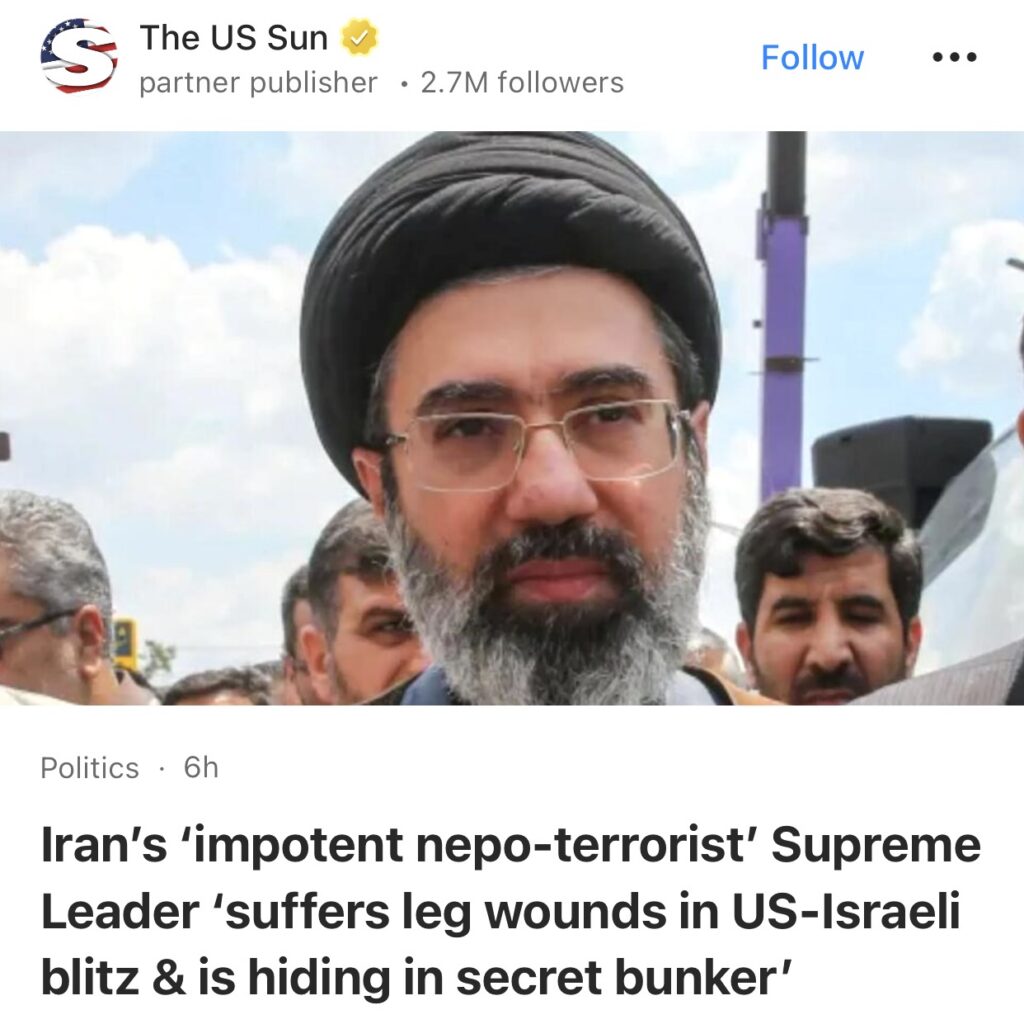 8。据The US Sun报道,伊朗“无能的亲法恐怖分子”最高领袖“在美以闪电战中腿部受伤,目前藏身于秘密地堡中”。