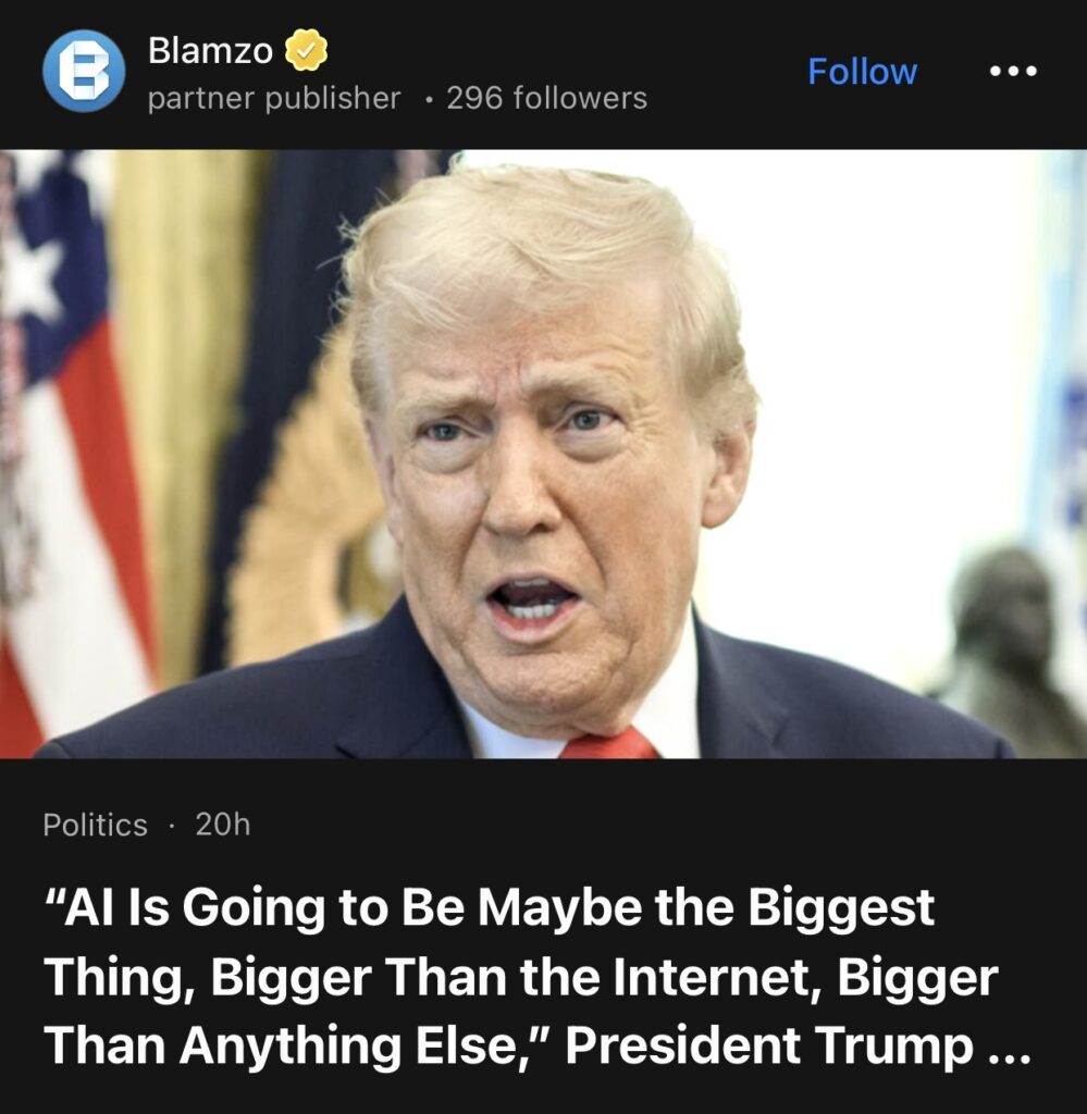4。据Blamzo报道 ”人工智能或许将成为最伟大的事物,比互联网更重要,比任何其他事物都更重要,”特朗普总统宣称,并称自己是“引领人工智能革命的总统”。