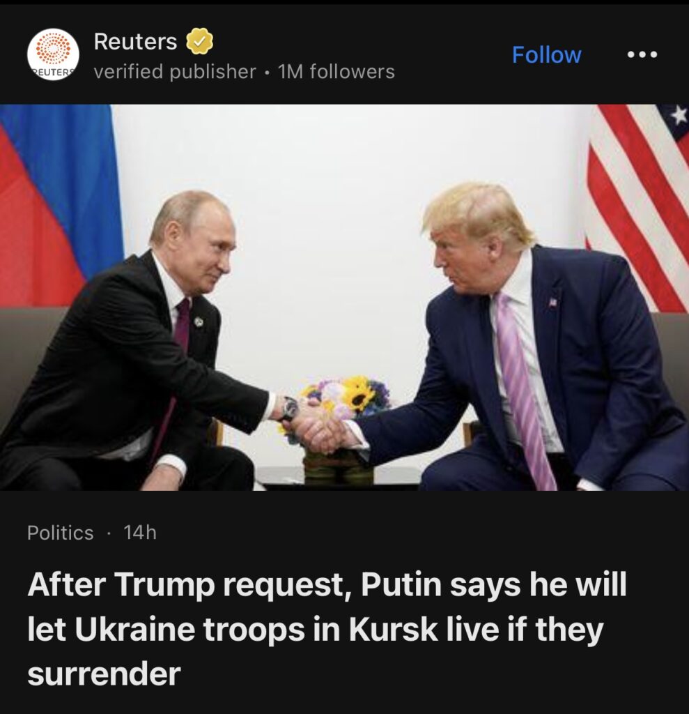 1。据Reuters报道,应特朗普要求,普京表示如果乌克兰在库尔斯克的军队投降,他将允许他们存活。