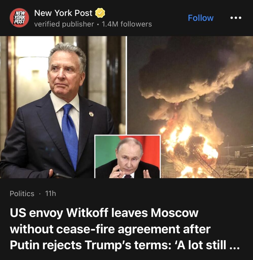 8。据New York Post华盛顿报道,俄罗斯总统弗拉基米尔·普京拒绝了特朗普总统关于开始结束与乌克兰战争的条件,总统特使史蒂夫·维特科夫周五离开莫斯科,没有达成停火协议。