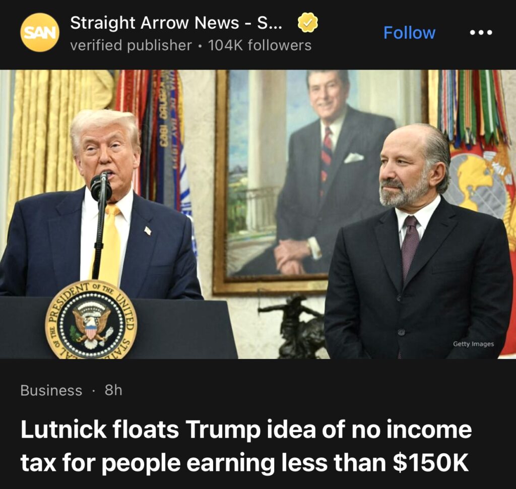 6。据Straight Arrow News报道,商务部长霍华德·卢特尼克暗示,唐纳德·特朗普总统希望取消年收入低于 15 万美元的人的所得税。他说,这是特朗普政府为所有美国人减税的总体计划的一部分。