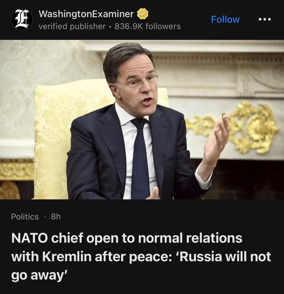 10。据WashingtonExaminer报道称,北约秘书长愿意在和平后与克里姆林宫恢复正常关系,并称: ”俄罗斯不会消失”。