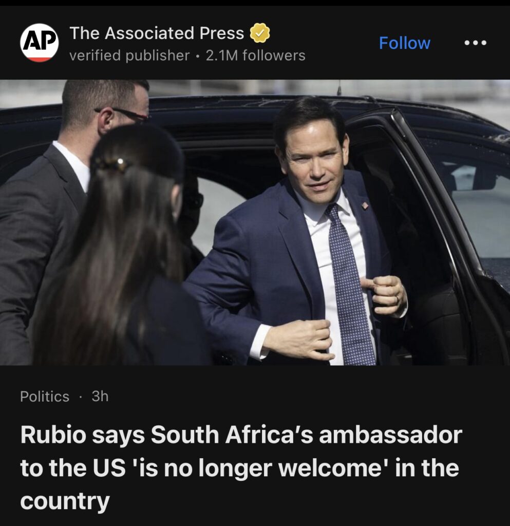 3。华盛顿(美联社)——美国国务卿马尔科·卢比奥周五表示,南非驻美国大使“不再受欢迎”,这是特朗普政府针对这个非洲国家的最新举措。卢比奥在 X 上的一篇帖子中指责易卜拉欣·拉苏尔是一名“煽动种族仇恨的政客”,他讨厌唐纳德·特朗普总统。卢比奥称这位南非外交官是“不受欢迎的人”。