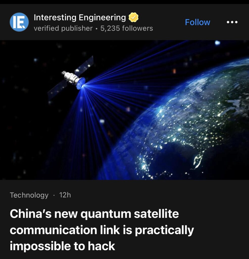 7。据Interesting Engineering报道,中国新型量子卫星通信链路几乎不可能被破解。