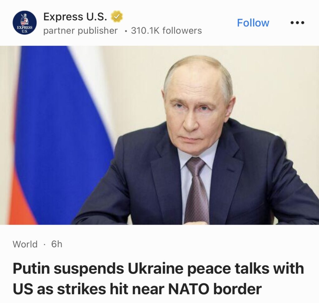 1。据Express U.S.报道,随着袭击逼近北约边境,普京中止与美国的乌克兰和平谈判。