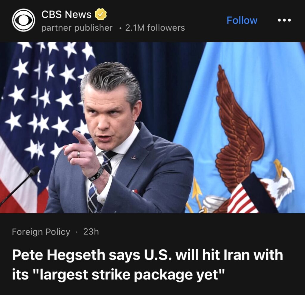 14。据CBS News报道,国防部长皮特·赫格塞斯周四表示,在以色列袭击一处伊朗气田且伊朗在整个地区展开报复之后,针对伊朗的战事中将出现“迄今为止规模最大的打击行动”。