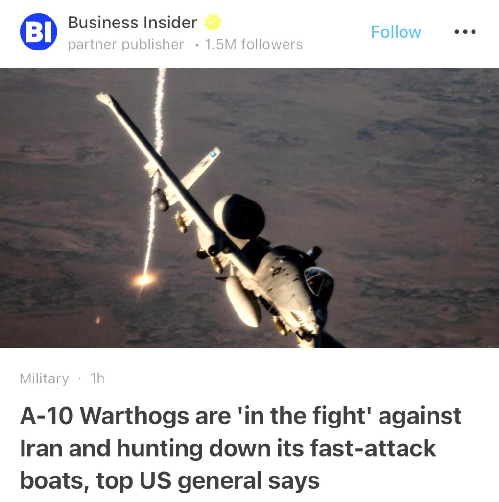 4。据Business Insider报道,一位美国高级将领表示,A-10“疣猪”攻击机已“投入战斗”,正针对伊朗并搜捕其快速攻击艇。
