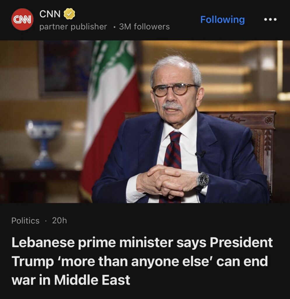 15。据CNN报道,黎巴嫩总理表示,特朗普总统“比任何人都更能”结束中东战争。
