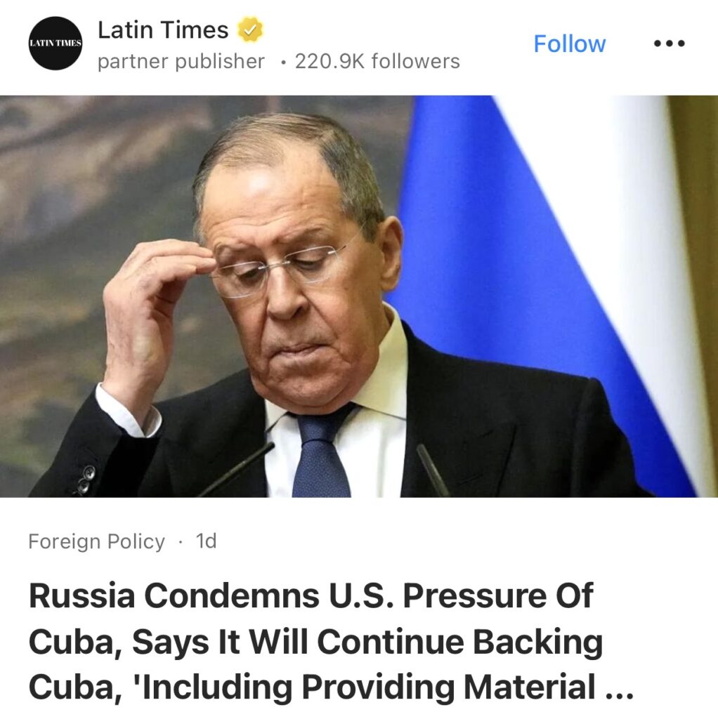 7。据Latin Times报道,俄罗斯谴责美国对古巴施压,表示将继续支持古巴,“包括提供物质支持”。