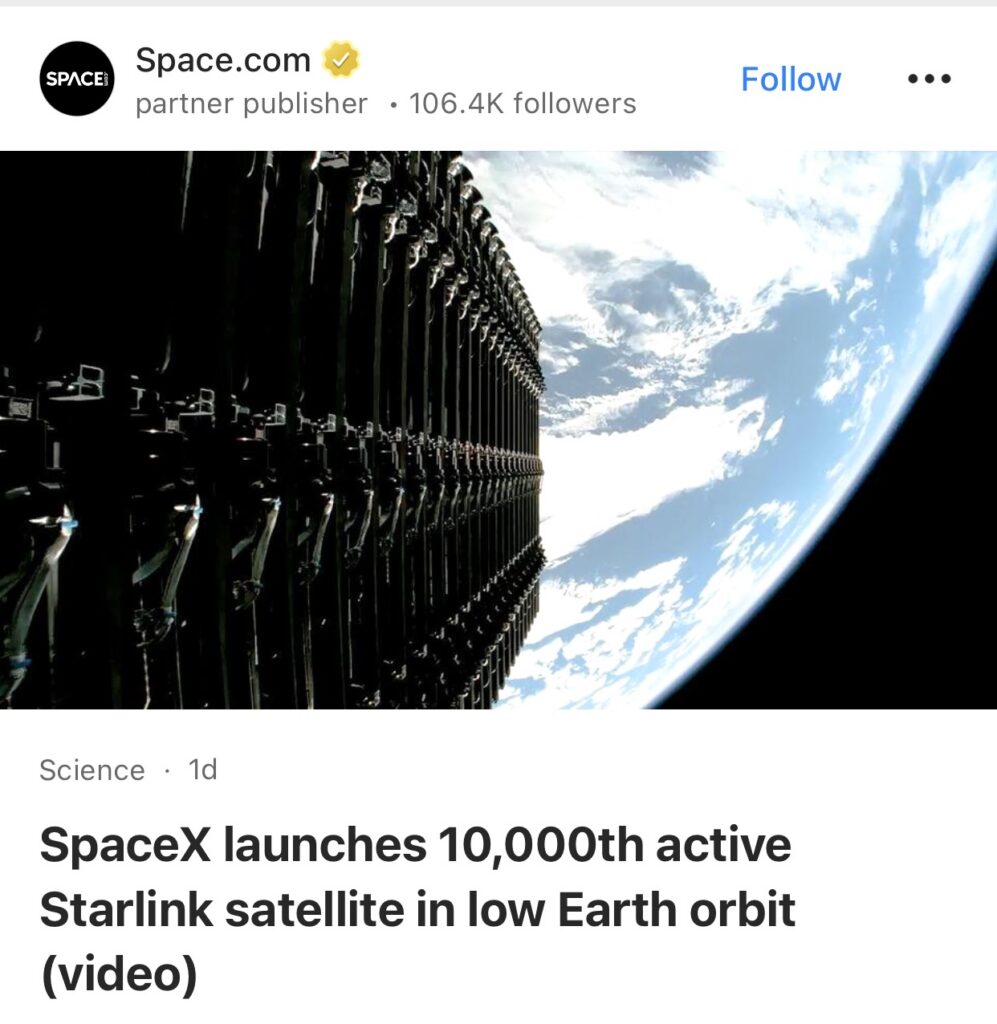 3。据Space.com 报道,SpaceX 公司发射了两批新型互联网中继卫星,共计54颗。具有里程碑意义的第1万颗“星链”卫星搭载于首枚“猎鹰9号”火箭之上,该火箭从加利福尼亚州的范登堡太空军基地成功将25颗卫星送入轨道。随后的第二次发射又从佛罗里达州的卡纳维拉尔角太空军基地增发了29颗卫星。