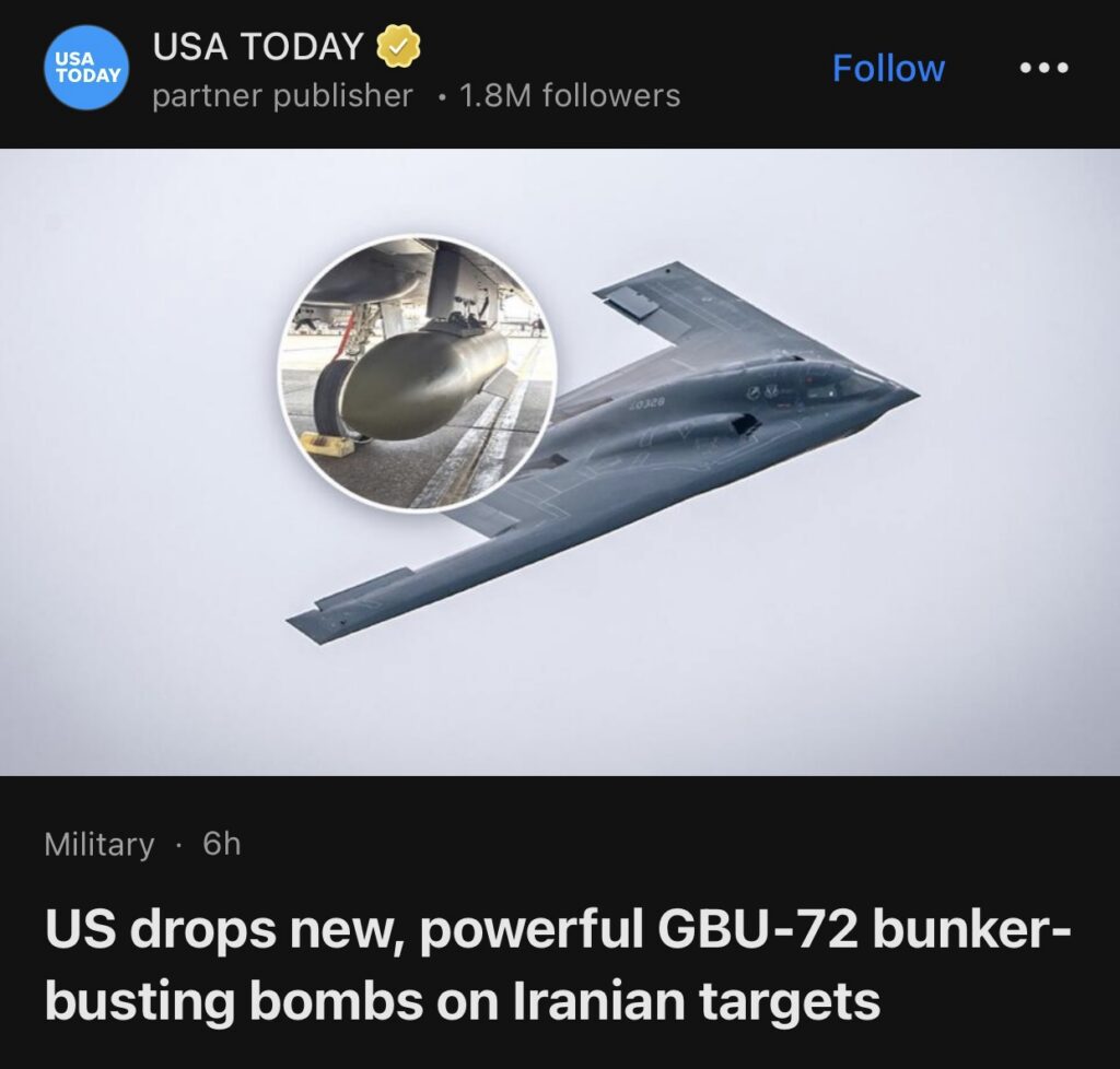 10。据USA TODAY报道,美国向伊朗目标投掷新型强力GBU-72掩体摧毁炸弹。