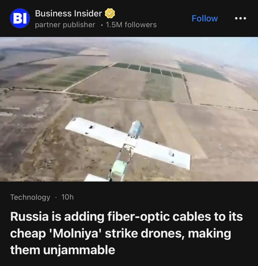 11。据Business Insider报道,俄罗斯正为其廉价的“莫尔尼亚”攻击无人机加装光纤线缆,使其具备抗干扰能力。