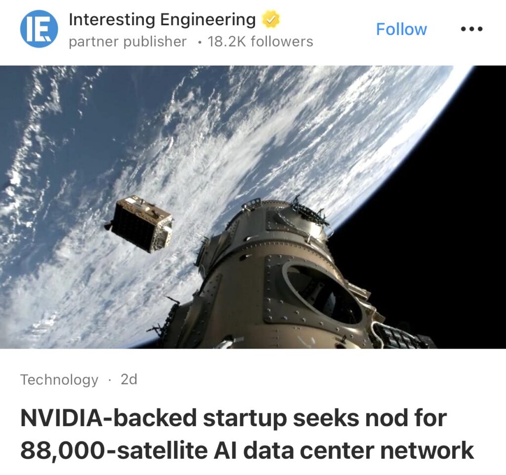5。据Interesting Engineering报道,英伟达支持的一家初创公司正寻求批准,拟建立由8.8万颗卫星组成的AI数据中心网络。