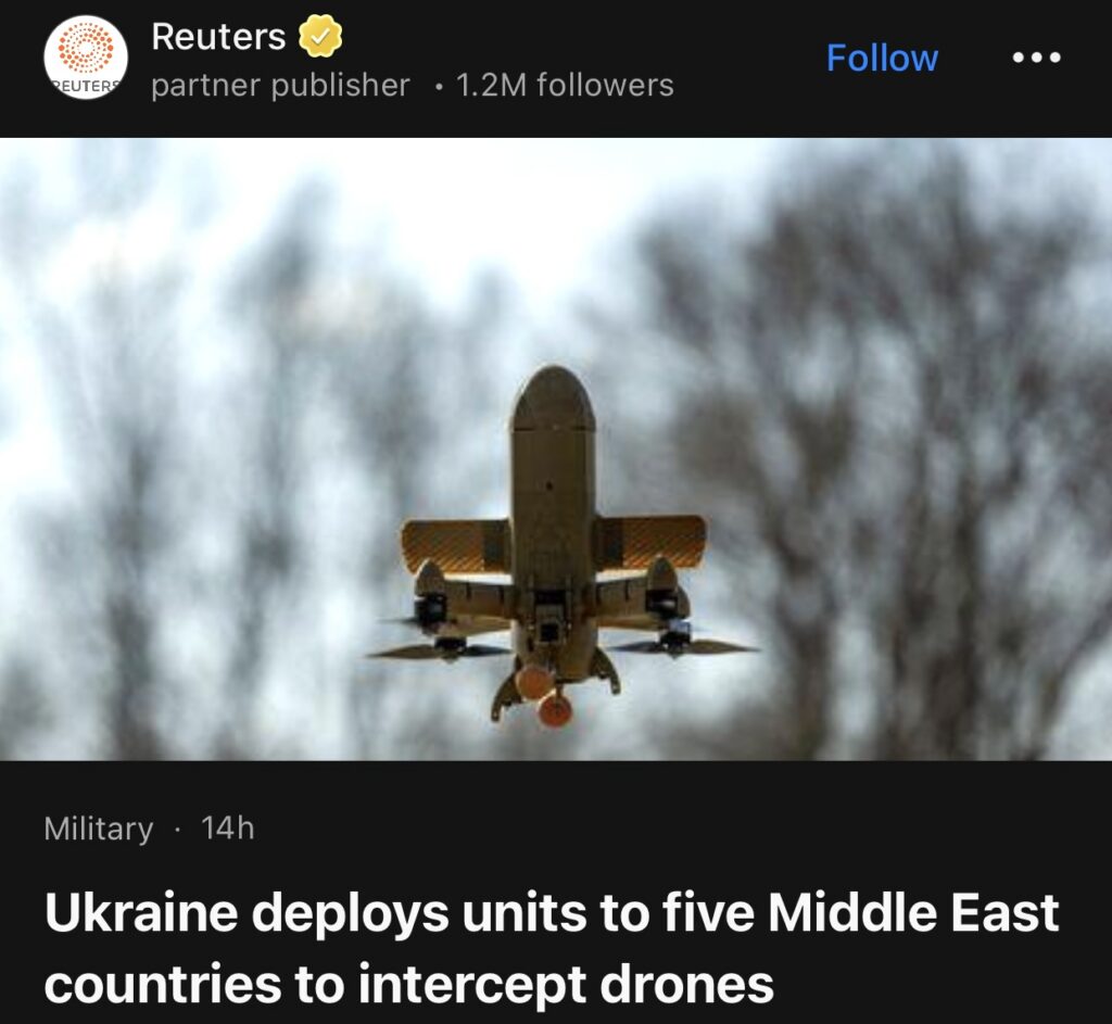 9。据Reuters报道,乌克兰向五个中东国家部署部队,以拦截无人机。