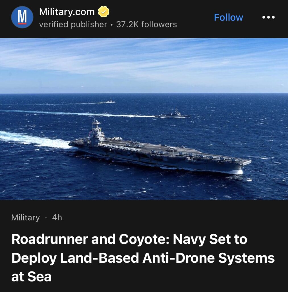 11。据Military.com报道,美国海军准备在海上部署陆基反无人机系统。美国舰队司令、海军上将达里尔·考德尔上周对记者说:“我们将在福特号打击群的驱逐舰上部署两套导弹系统,即‘跑路者’系统和‘郊狼’系统,这两套导弹系统都是专门为攻击无人机而设计的。”
