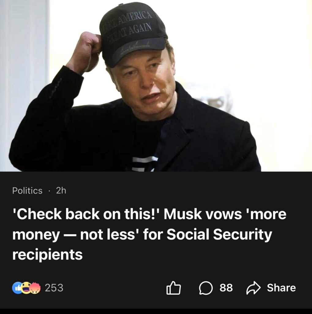 9。据Raw Story报道,马斯克承诺为社会保障受助者提供“更多钱,而不是更少”。
