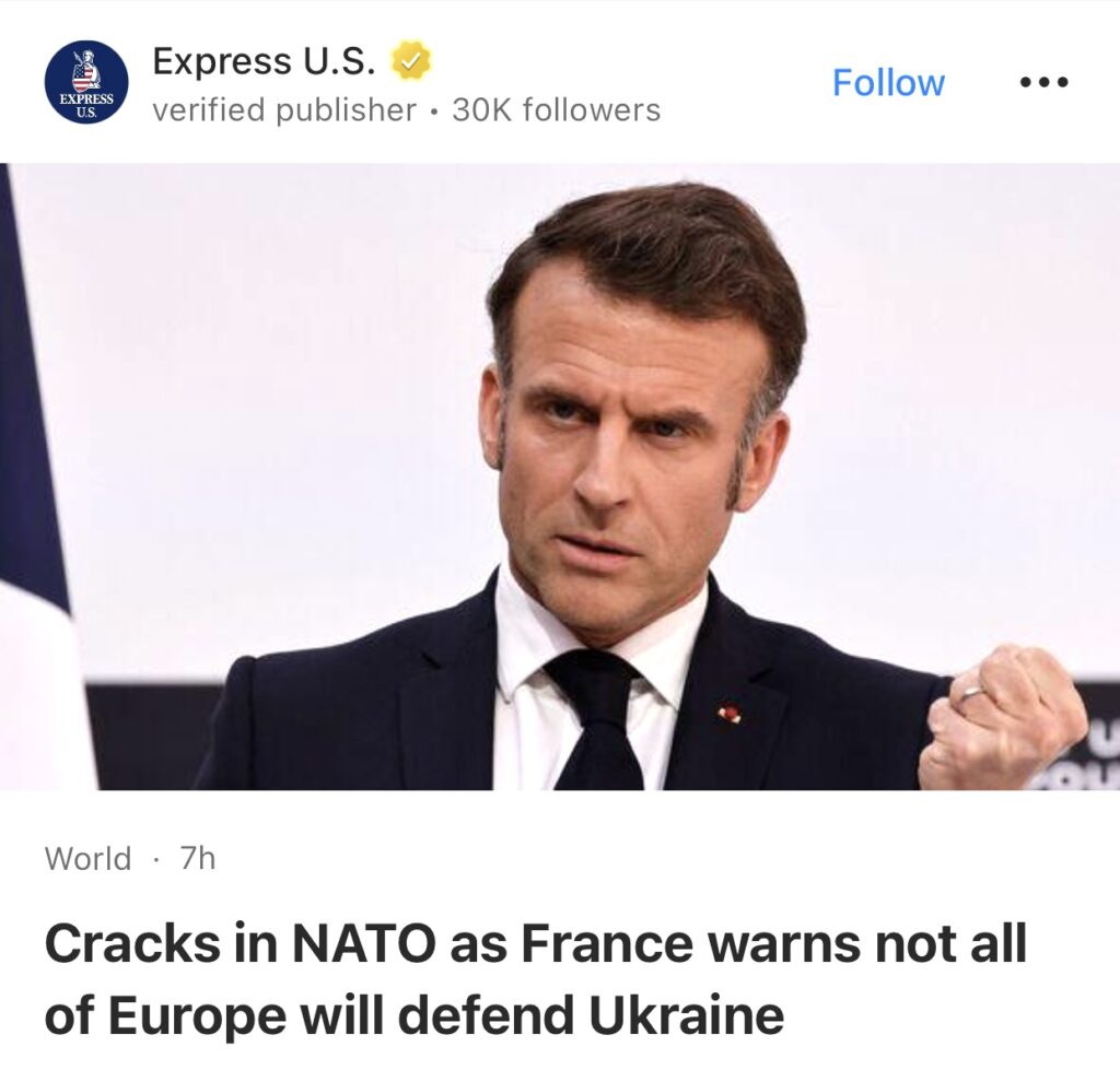2。据Express U.S.报道,北约出现裂痕,法国警告并非所有欧洲国家都会保卫乌克兰。法国总统埃马纽埃尔·马克龙周四表示,乌克兰的欧洲盟友周四并未全部同意向乌克兰部署军队以支持最终的和平协议,只有一部分国家愿意参与。