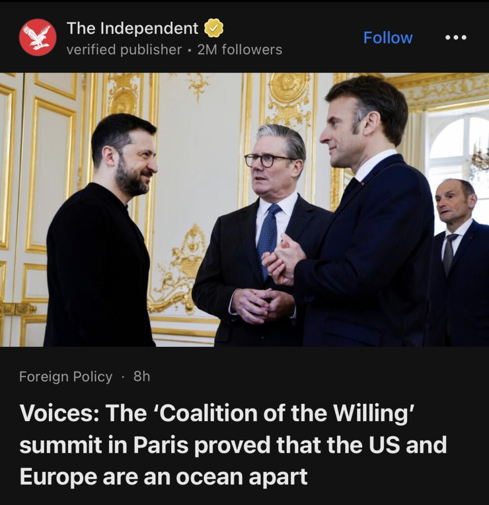 13。据The Independent报道,巴黎“自愿联盟”峰会证明,美国和欧洲已分道扬镳。