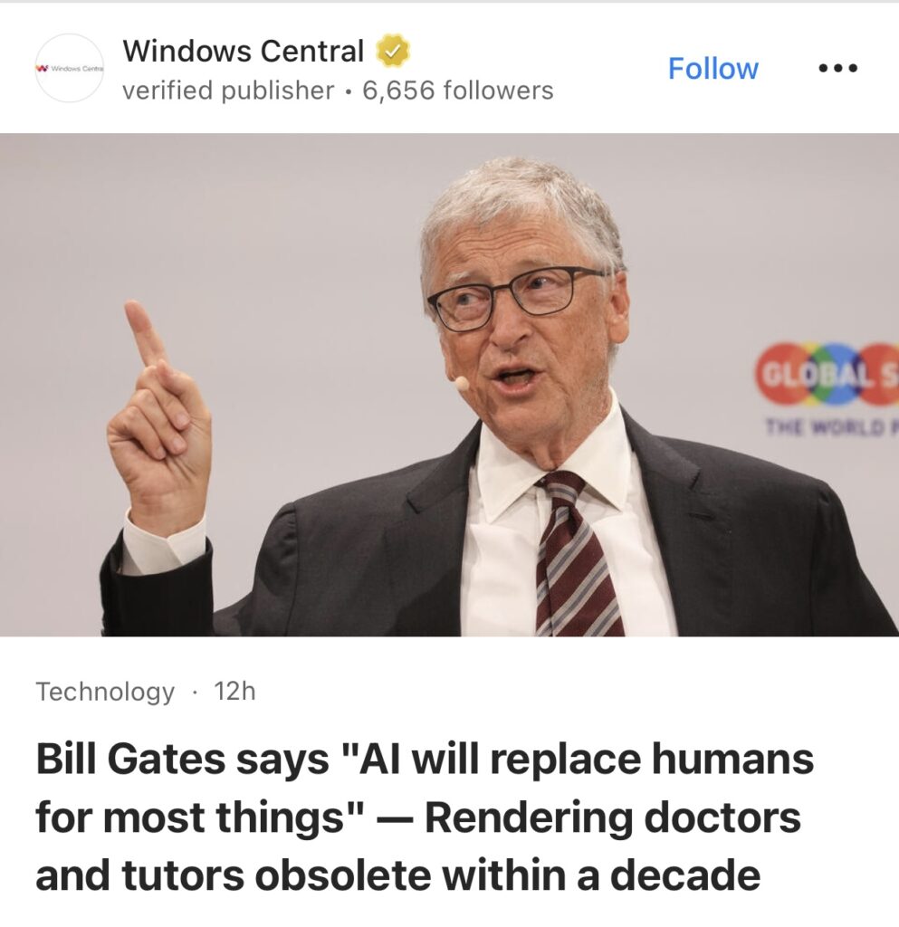 1。据Windows Central报道,比尔盖茨说“人工智能将在大多数事情上取代人类”,十年内让医生和教师消失。