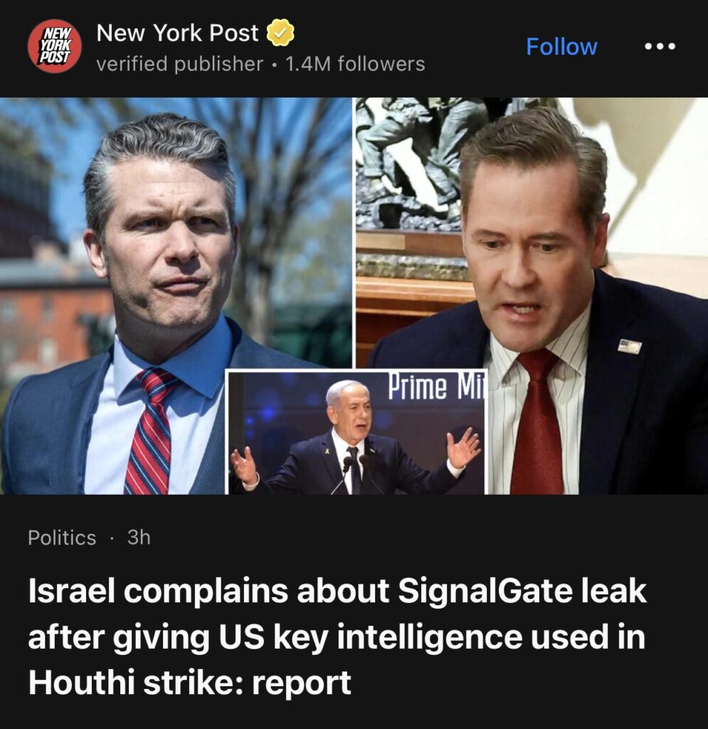 14。据New York Post报道称,以色列抱怨 SignalGate 泄密事件,此前以色列向美国提供了胡塞武装袭击的关键情报。