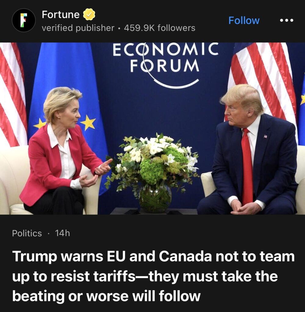 6。据Fortune报道,特朗普警告欧盟和加拿大不要联手抵制关税——他们必须承受打击,否则更糟糕的事情将接踵而至。