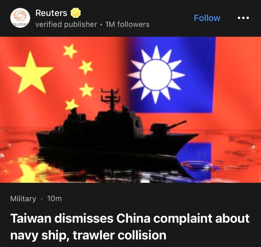 12。台北(路透社)——台湾国防部长周五驳斥了中国关于台湾海军舰艇与中国拖网渔船在敏感的台湾海峡相撞的抗议,并表示台北将继续根据需要进行军事演习。