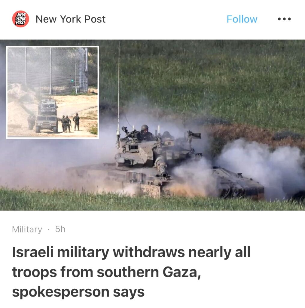 7。据New York Post报道称,以色列军队从加沙南部撤出几乎所有部队。此次撤军之际,埃及正准备主办新一轮旨在达成停火和释放人质协议的会谈。