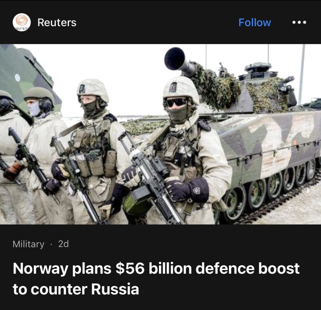 11。据奥斯陆路透社报道,北约成员国政府周五表示,挪威计划到 2036 年累计增加 6000 亿克朗(560 亿美元)的军费开支,以加强防御俄罗斯和其他安全挑战。