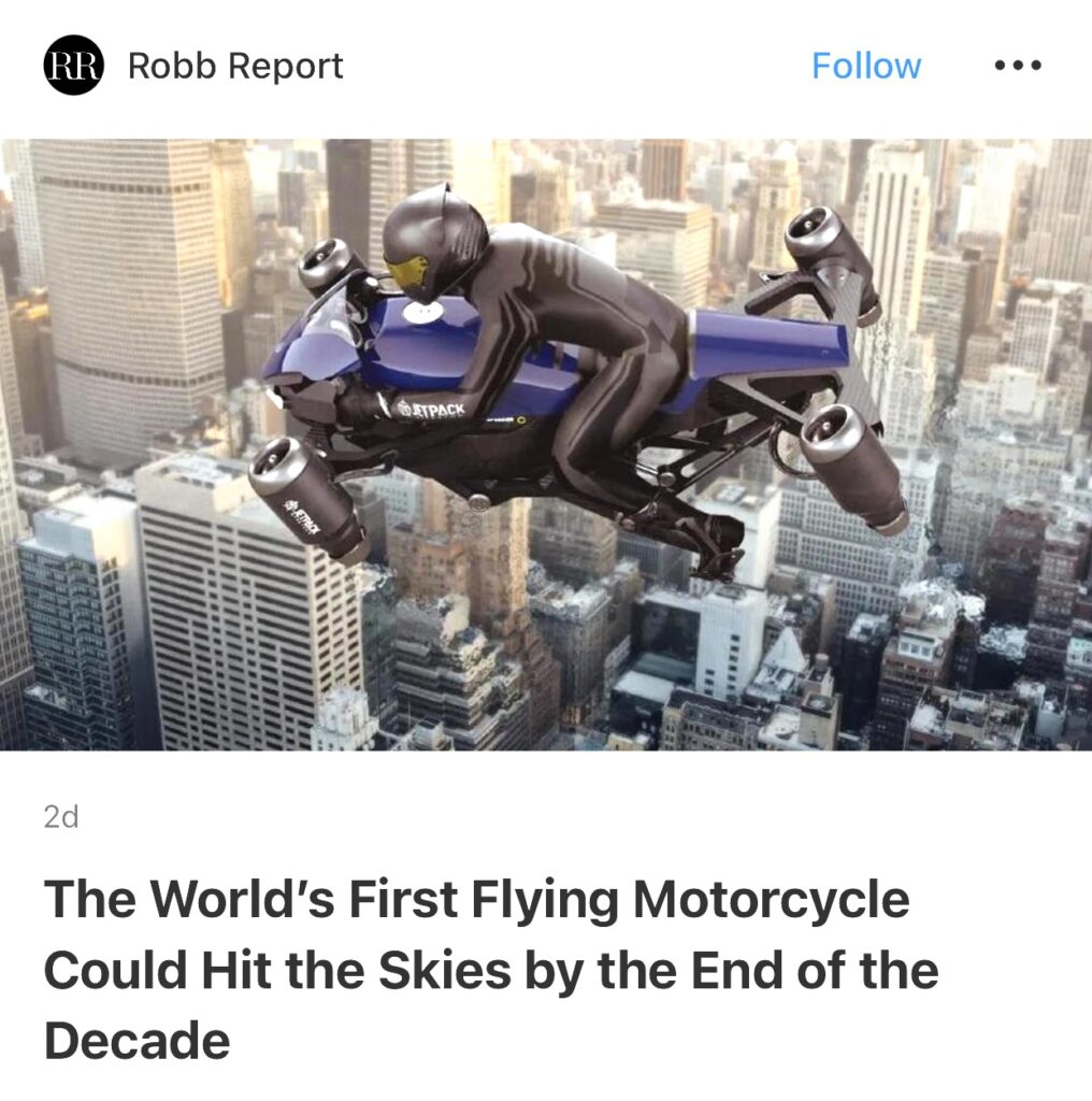 2。据Robb Report报道,世界上第一辆飞行摩托车可能在本世纪末飞上天空。“电动无人机可以承载 20 到50 磅的重量,飞行速度为 100 英里/小时,”梅曼说。“我们可以承载 100 到 500 磅的重量,并以接近 500 英里/小时的速度飞行。”容量和速度的独特结合引起了政府的注意,从而与国防部达成了开发协议。