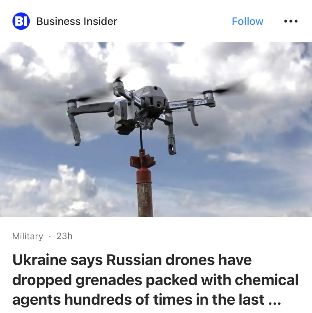 4。据Business Insider报道,乌克兰称俄罗斯无人机,上个月投掷了数百次装有化学制剂的手榴弹。乌克兰称,这些化学爆炸违反了联合国《化学武器公约》。