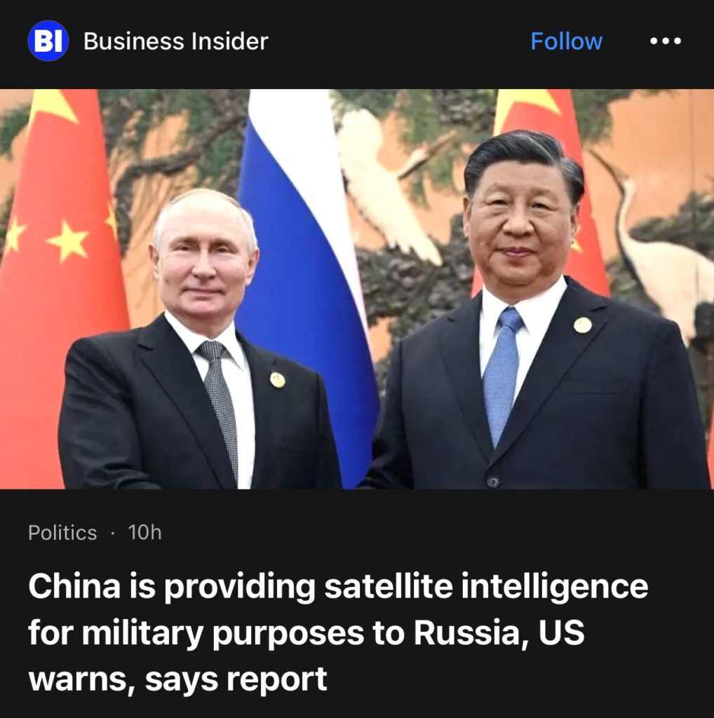10。据Business Insider报道,美国警告称,中国正在向俄罗斯提供,用于军事目的的卫星情报。如果中国公司支持俄罗斯的战争努力,将会产生“重大后果”。