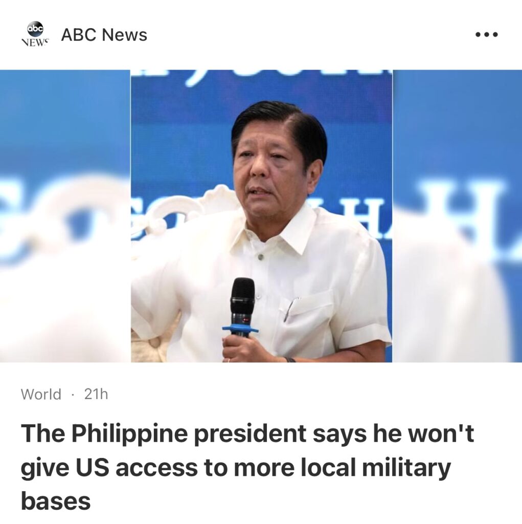 9。据ABCNews菲律宾马尼拉报道,菲律宾总统周一表示,他的政府没有计划让美国进入更多菲律宾军事基地,并强调美国军队迄今为止在多个营地和地点的存在是由中国在有争议的南部地区的侵略行动引发的。