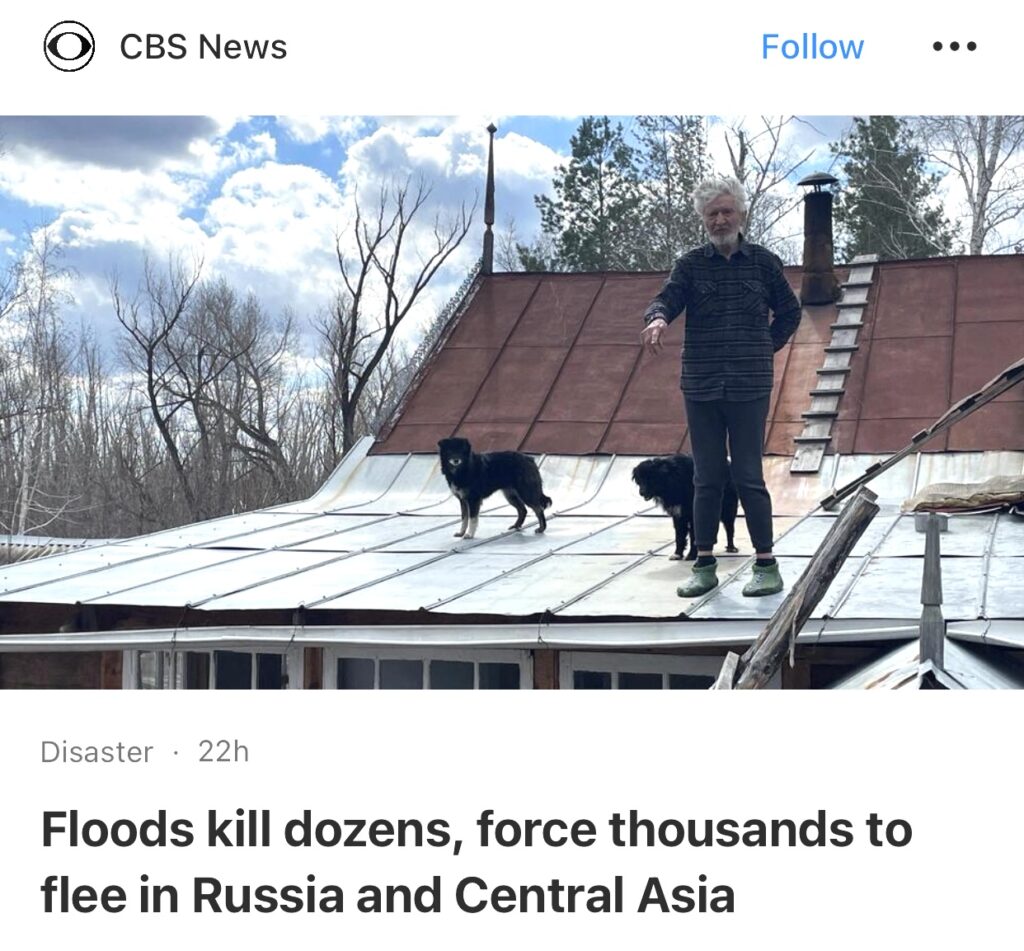 5。据CBS News报道,反常的季节性强降雨导致俄罗斯南部和中亚大片地区遭受洪水侵袭,阿富汗和巴基斯坦数十人死亡,哈萨克斯坦和俄罗斯数万人被迫逃离家园。