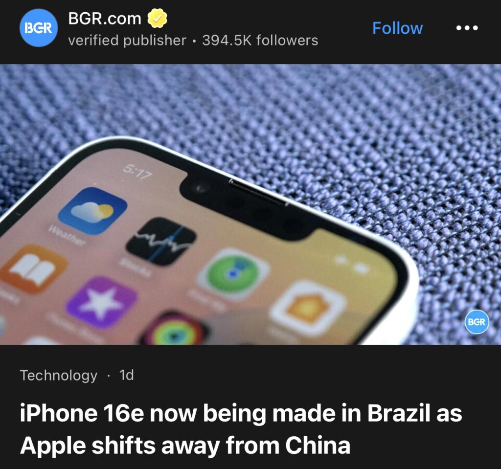 12。据BGR.com报道,随着苹果将生产重心从中国转移,iPhone 16e 现将在巴西生产。