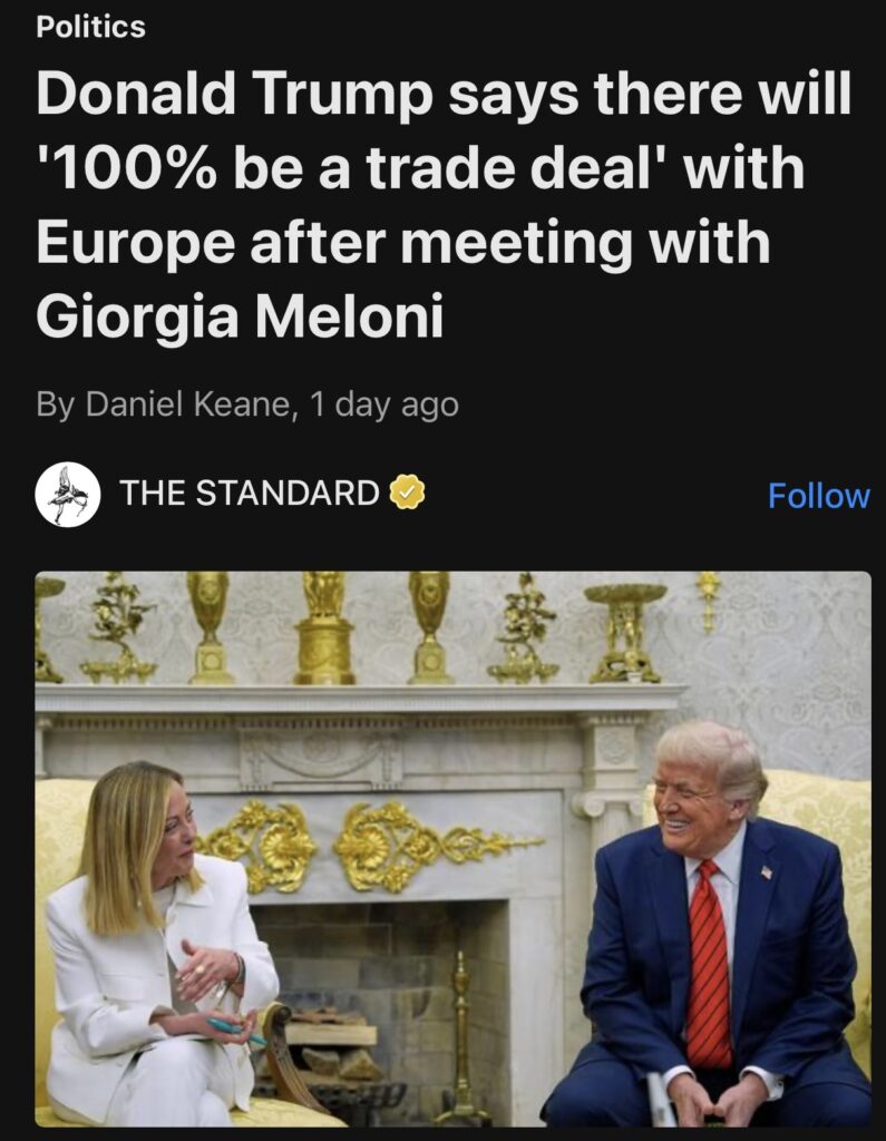 13。据THE STANDARD报道,唐纳德·特朗普与乔治亚·梅洛尼会面后表示,将与欧洲“100%达成贸易协议”。