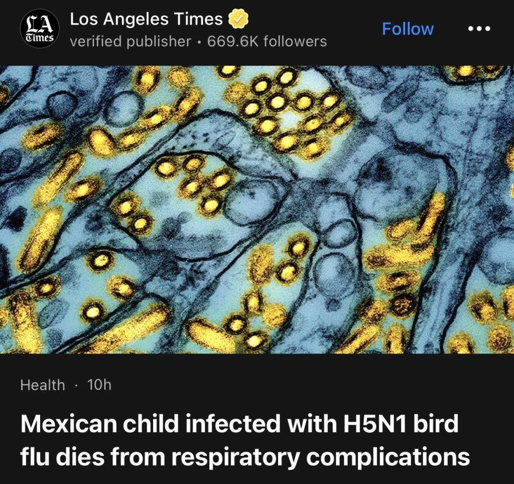 6。据Los Angeles Times报道,根据世界卫生组织本周发布的报告,墨西哥一名 3 岁女孩本月因感染 H5N1 禽流感病毒死亡。