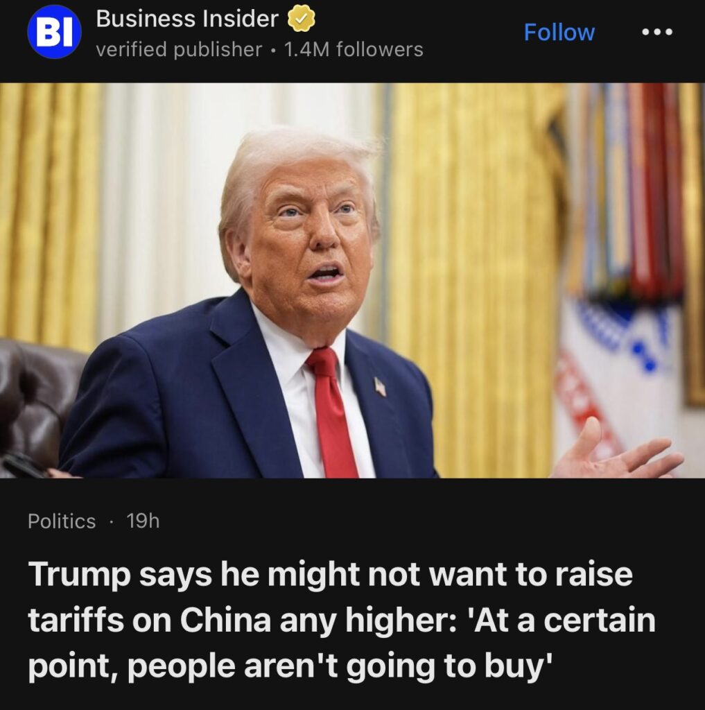 4。据Business Insider报道,特朗普称他可能不想进一步提高对华关税,并称,”到了一定程度,人们就不会买了”。
