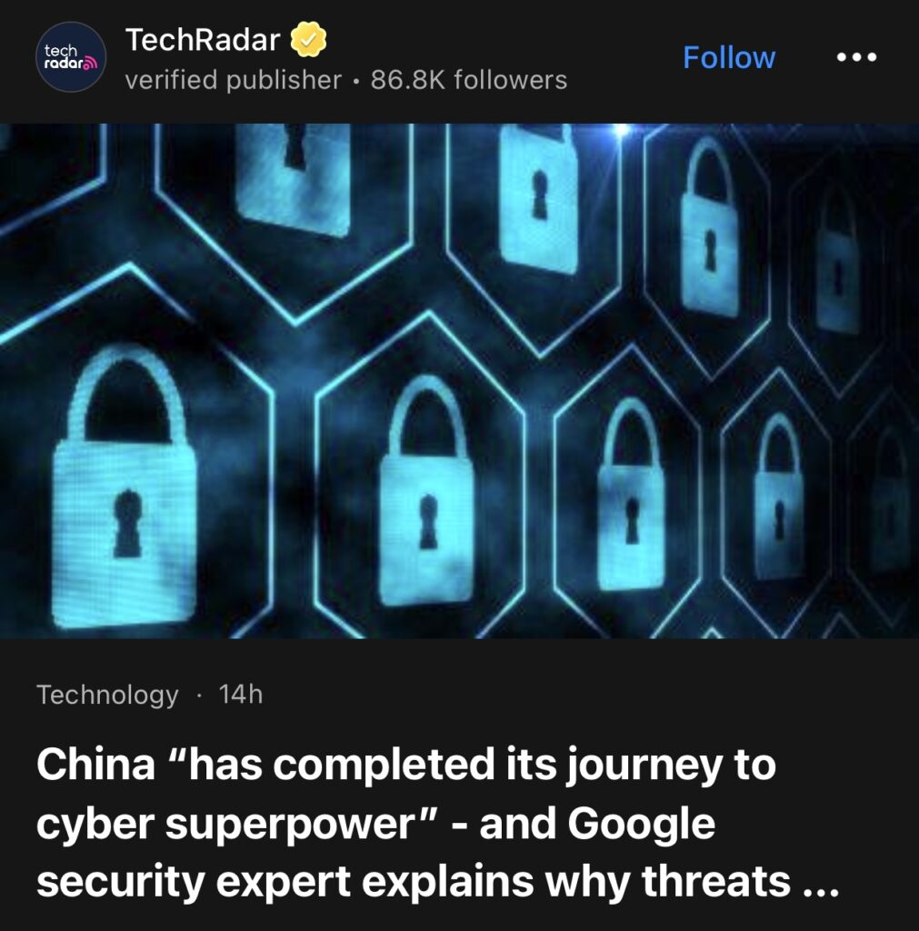 1。据TechRadar报道,中国“已完成网络超级大国之旅”——谷歌安全专家解释未来几年威胁可能进一步加剧。